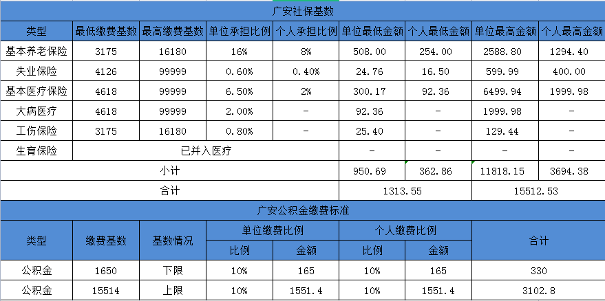 以下是廣安市2021年社保、公積金繳費(fèi)基數(shù)表